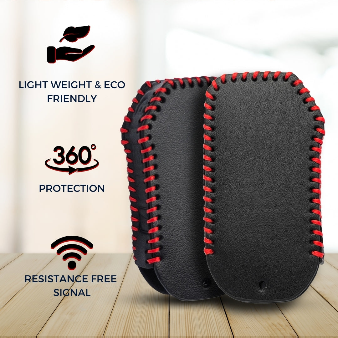 The key cover made of classic leather. Stylish and pretty durable, fits like a glove. Full signal, will not block the signal. Excellent touch feeling, looks good.