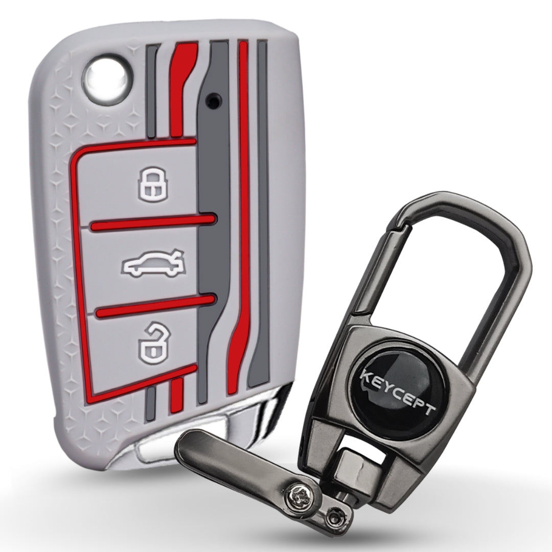 Keycept Tristar Silicone Car Key Cover for Skoda Kushaq, Octavia, Kodiaq, Superb, Slavia, Passat, Virtus, T Roc 3 Button Flip Key with Keychain (Type K2)