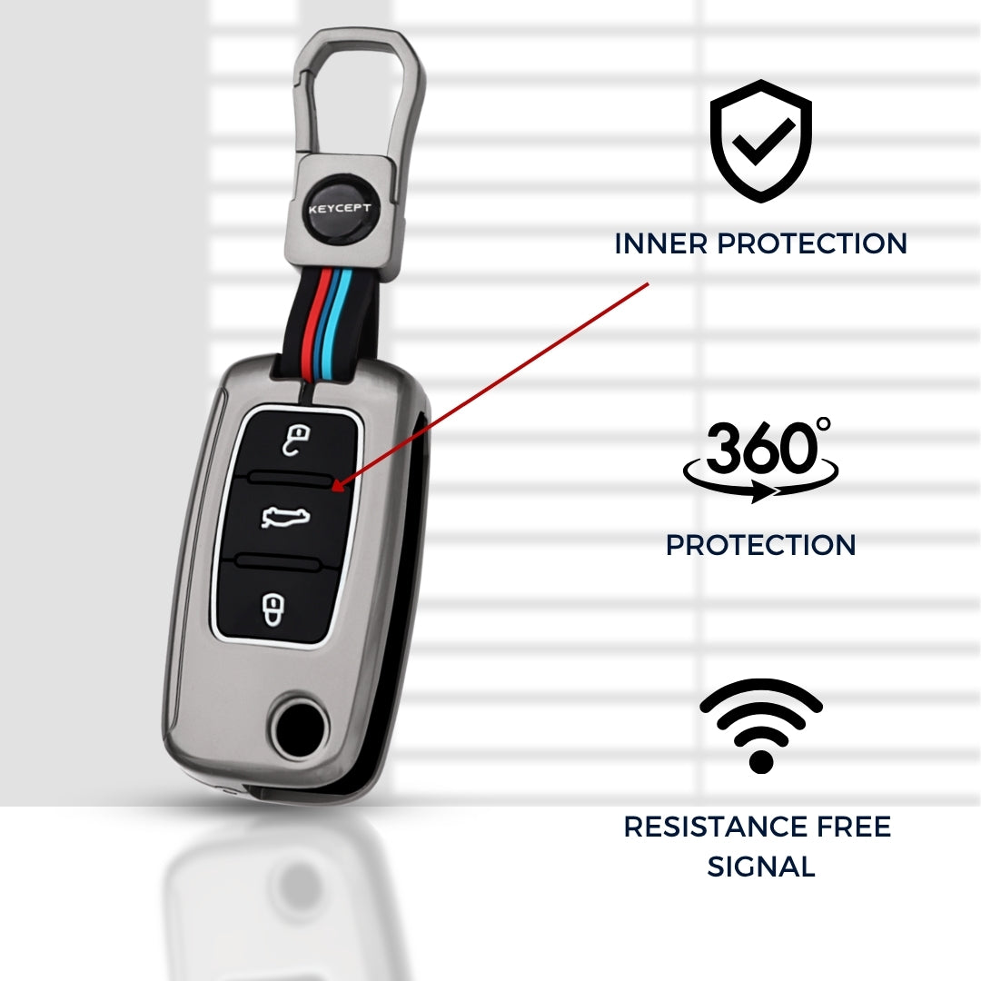 Keycept Metal Alloy Car Key Cover for Skoda/ Volkswagen Polo, Vento, Jetta, Ameo, Passat, Rapid Laura Superb Octavia, Fabia, Yeti 3 button Flip key Cover with Keychain (Dual Black & Tan)